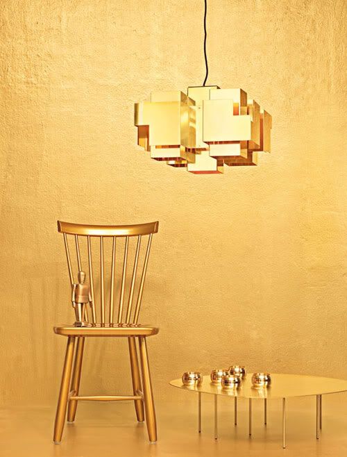 Is gold back? Have you noticed more and more golden interior design details? It's seems to be a new trend in general retro fever.  Here is some styling inspiration from Stockholm Furniture Fair - even Carl Malmsten's Little Aland chair is wearing a shiny finish. And have a look at Suburban Skyline lamp from Swedish desigh studio Folkform - 70's style incarnation?